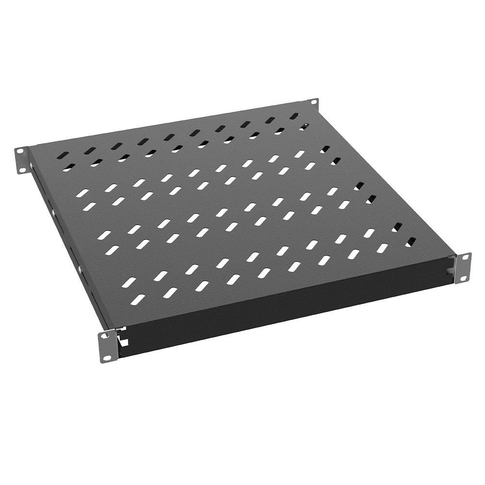 The EDISION Fixed Shelve 19'' 1U D50cm for D80cm Cabinet 50kg, designed and manufactured for robustness and durability, complements the configuration inside the rack cabinet, according to the professional installer's choices. In black, with a strength of up to 50 kg, it has 4 rows of 20 holes, which facilitate the ventilation of the cabin from floor to floor, while they can also be used for screw fixing of devices inside the rack.