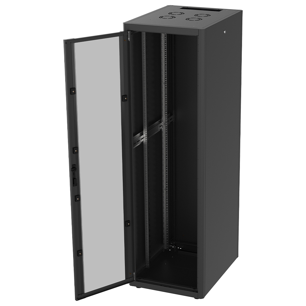 This SELECT-range cabinet features a front door with a metal frame and 4.0mm glass with a security lock and an easy door removal system that allows you to change the opening direction in the minimum possible time. Additionally, the side doors are lockable.Moreover, it has integrated "U" numbering, height-adjustable ground spacers, a special lock with integrated handle and the ability to add a fan KIT (optional extra accessory), onto the top section.