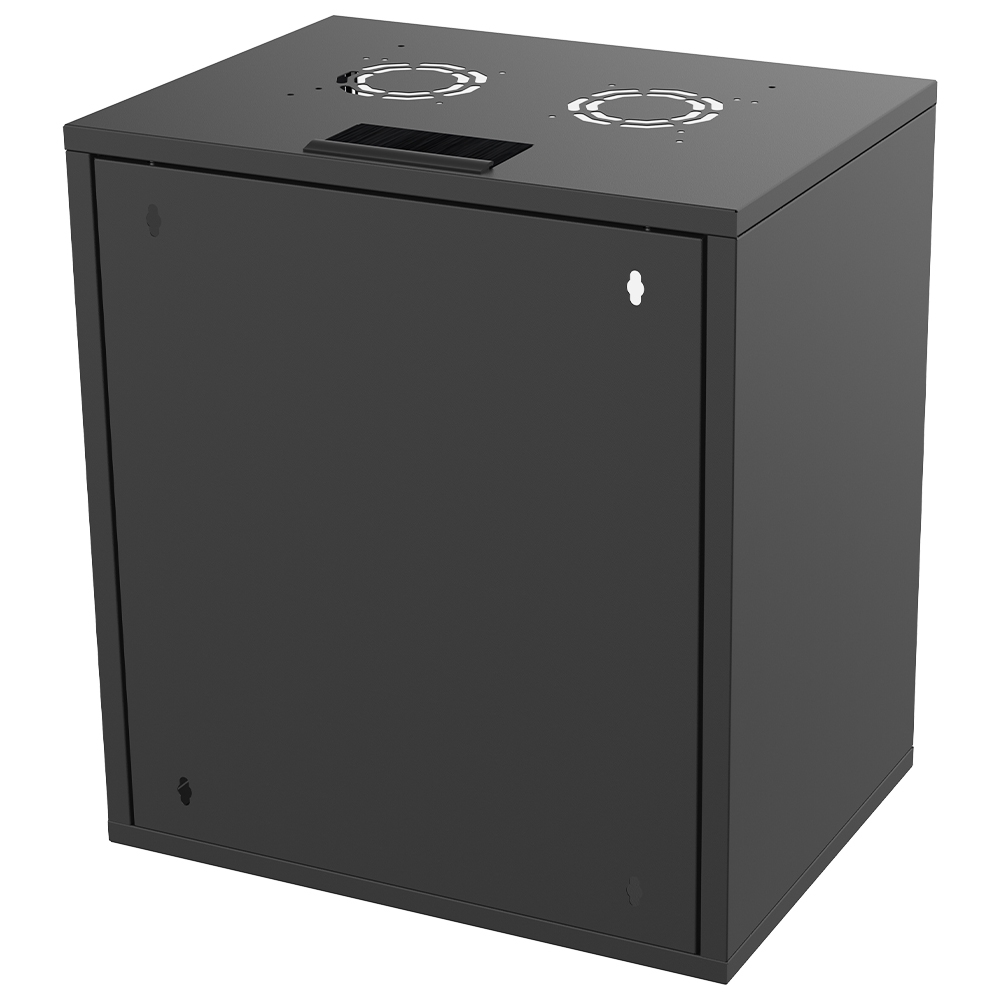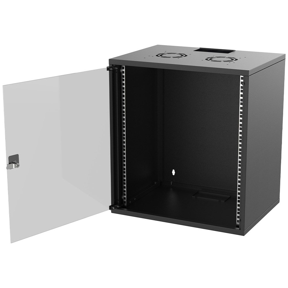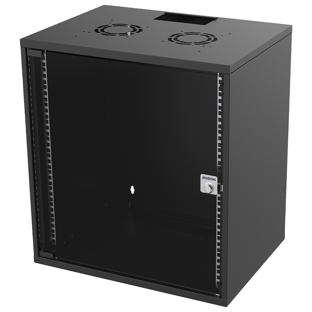 EDISION SOHO Wall-Mounted Cabinet 19" 540x400 12U black ''flat pack'', is an excellent choice of basic rack cabinet, in a compact ''flat pack'' package for convenient transport, with all the individual parts inside for quick and easy assembly. It has a 4.0mm glass front door with security lock, 2 cable routing ports on the top and bottom, passive ventilation on the top, which is also easily upgraded to active, with the addition of the extra optional product code of fan KIT.