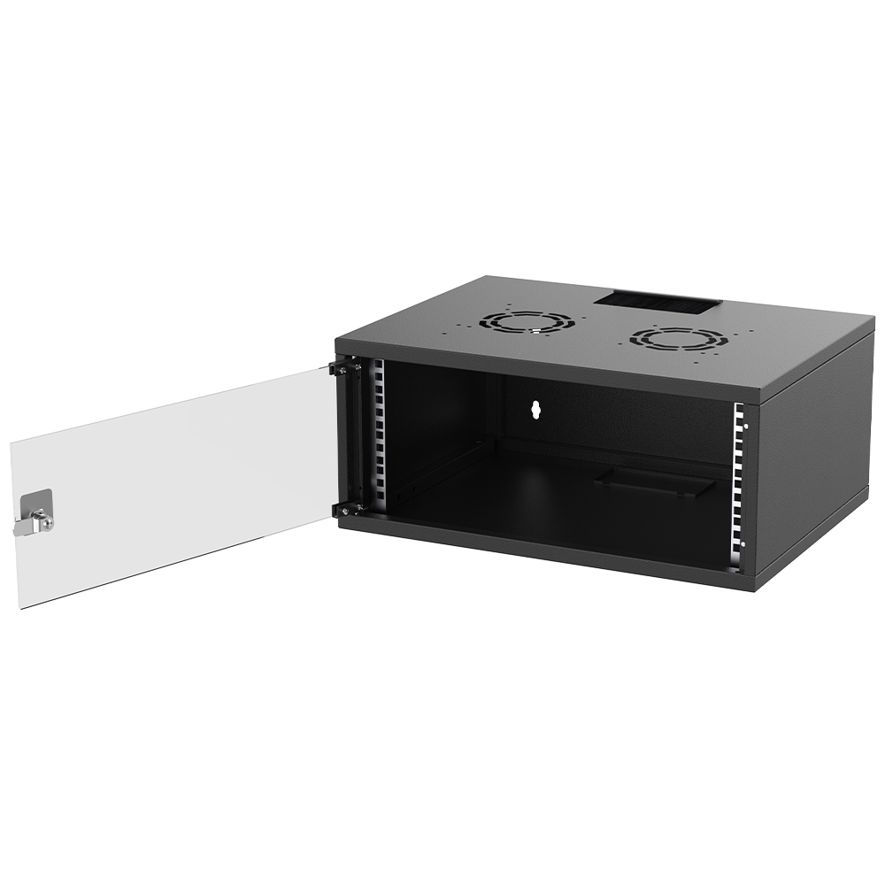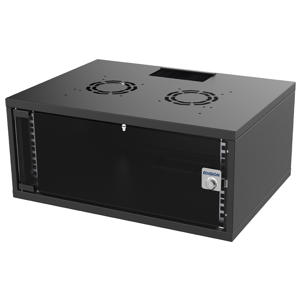 EDISION SOHO Wall-Mounted Cabinet 19" 540x400 4U black ''flat pack'', is an excellent choice of basic rack cabinet, in a compact ''flat pack'' package for convenient transport, with all the individual parts inside for quick and easy assembly. It has a 4.0mm glass front door with security lock, 2 cable routing ports on the top and bottom, passive ventilation on the top, which is also easily upgraded to active, with the addition of the extra optional product code of fan KIT.