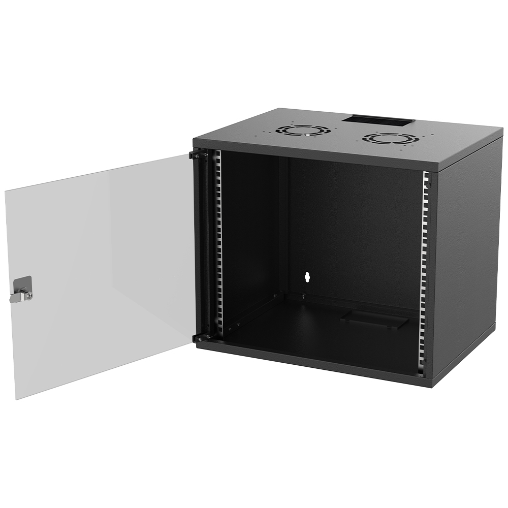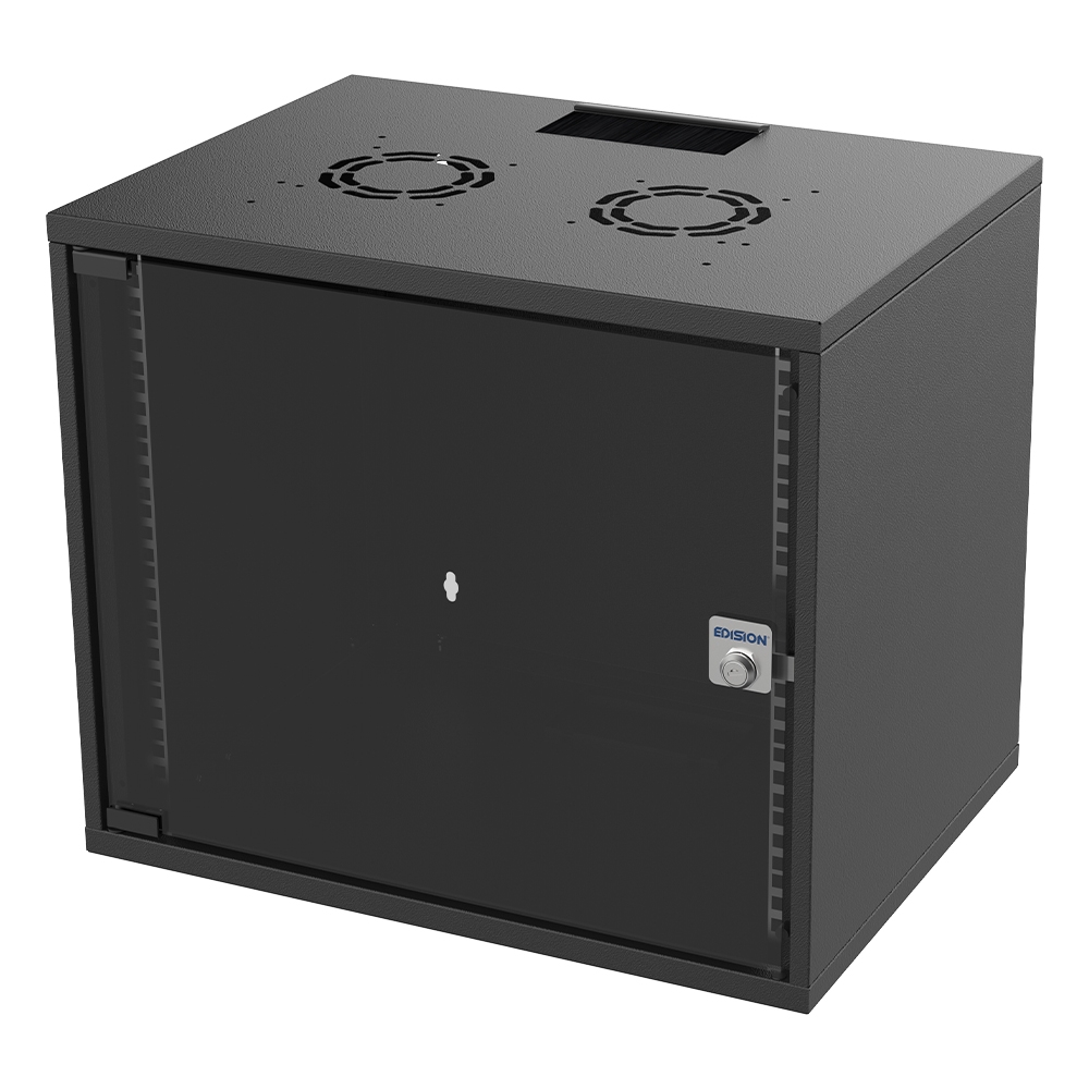EDISION SOHO Wall-Mounted Cabinet 19" 540x400 9U black ''flat pack'', is an excellent choice of basic rack cabinet, in a compact ''flat pack'' package for convenient transport, with all the individual parts inside for quick and easy assembly. It has a 4.0mm glass front door with security lock, 2 cable routing ports on the top and bottom, passive ventilation on the top, which is also easily upgraded to active, with the addition of the extra optional product code of fan KIT.