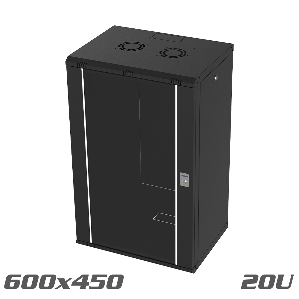 EDISION SOHO pro Wall-Mounted Cabinet 19" 600x450 20U black, is an excellent choice of assembled rack cabinet, ready to install. It has a front door with a metal frame and 4.0mm glass with a security lock, which has an easy-to-remove system that allows you to change the opening direction in the minimum possible time. In addition, the side doors can be opened, by using the on-board lock. Also, it has an easy-to-install wall mount, 3 cable routing ports on the top, bottom and rear, with removable covers for protection from dust entering the cabinet. The cabinet features passive ventilation on the top, which can be easily upgraded to active, with the addition of the optional extra product code of fan KIT.