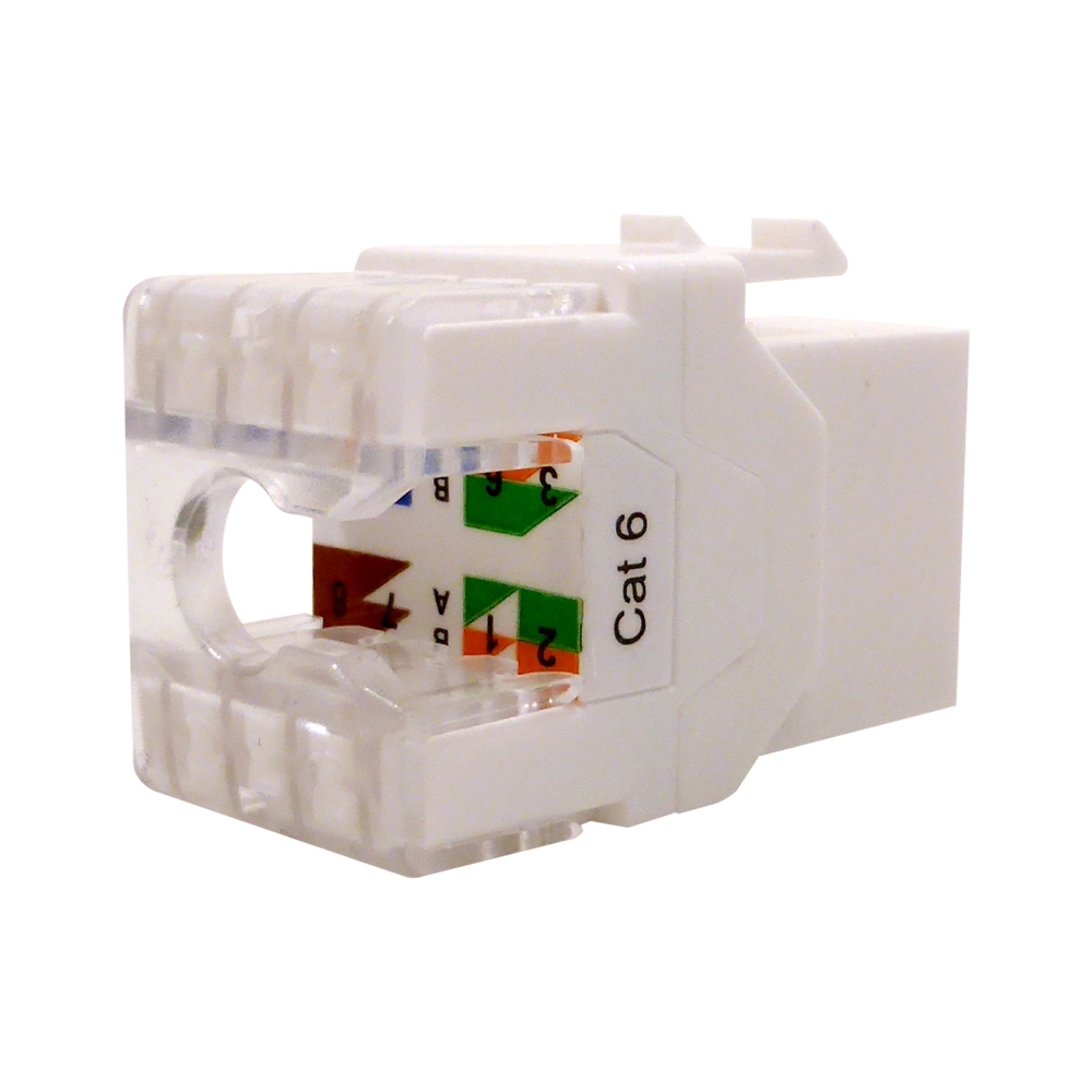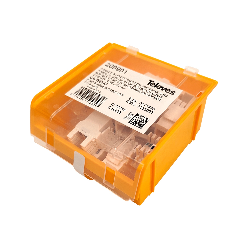 To TELEVES 209901 Keystone Jack RJ45 UTP Cat.6 Θηλυκό 90°/180° white, είναι μια μονάδα Keystone RJ45 Θηλυξό CAT 6, UTP, για καλώδια δεδομένων, εύκολη στη σύνδεση και επαναχρησιμοποιήσιμη έως και 1500 φορές (εκτιμώμενο), επομένως μπορεί να αφαιρεθεί και να επανεγκατασταθεί για διευκόλυνση της διαδικασίας εφαρμογής. Αυτή η μονάδα είναι συμβατή με την τεχνολογία PoE/PoE+/PoE++ (Power over Ethernet), επιτρέποντας στο καλώδιο να τροφοδοτεί συσκευές δικτύου, παρέχοντας συμβατότητα καλωδίων Cat 6 ή χαμηλότερη. Η μπροστινή (180°) ή η γωνιακή (90°) είσοδος καλωδίου, παρέχει στον τεχνικό εύκολη πρόσβαση στη σύνδεση, επίσης με τον πίνακα συνδέσεων (A ή B) στα σημεία σύνδεσης, τα οποία έχουν επιχρυσωμένες ακίδες 50 microns.