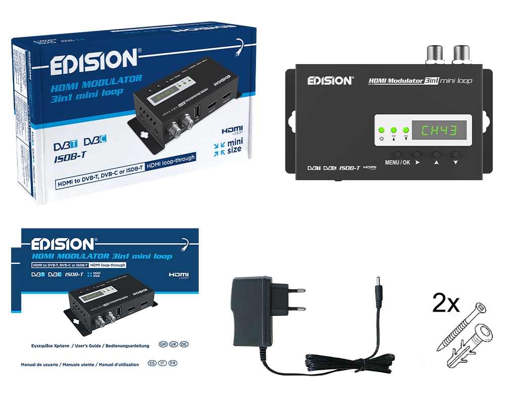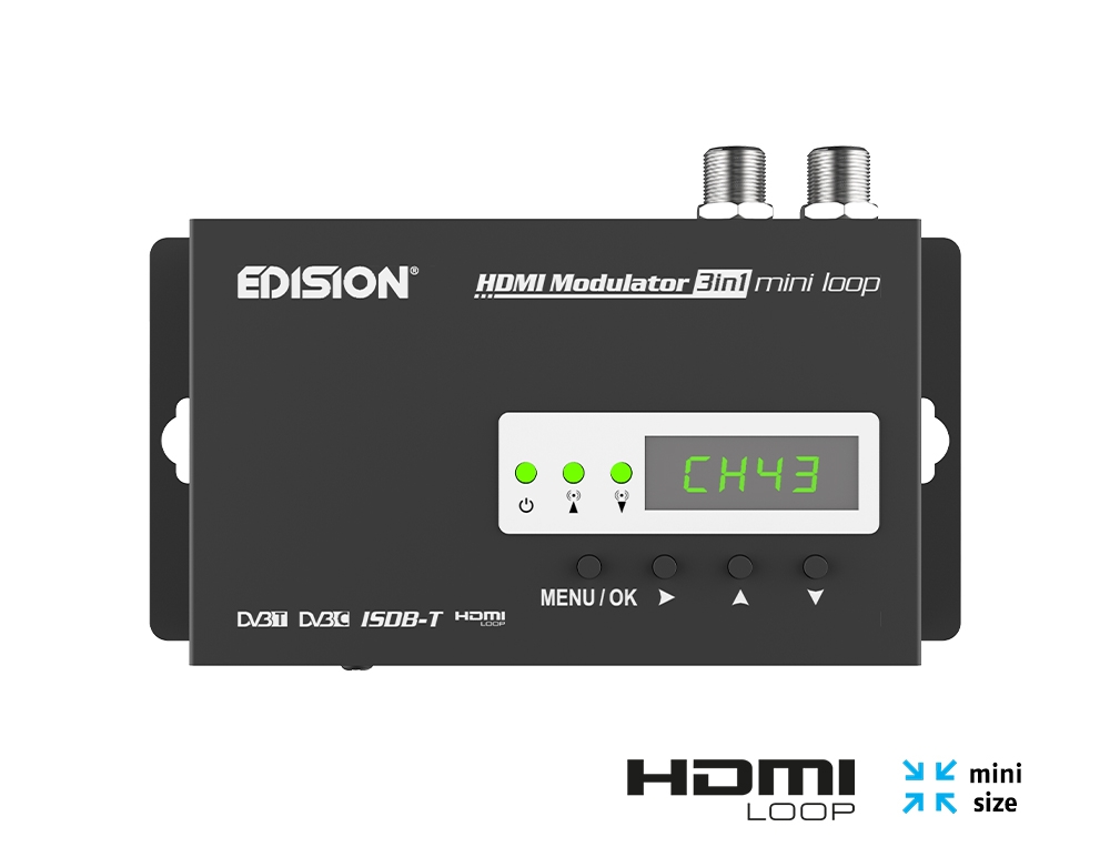 - Ψηφιακός μονοκάναλος Διαμορφωτής HDMI σε DVB-T, DVB-C ή ISDB-T με HDMI-loop έξοδο σε mini μέγεθος
