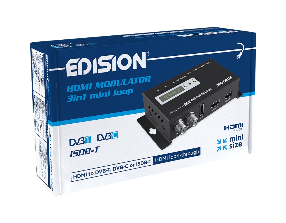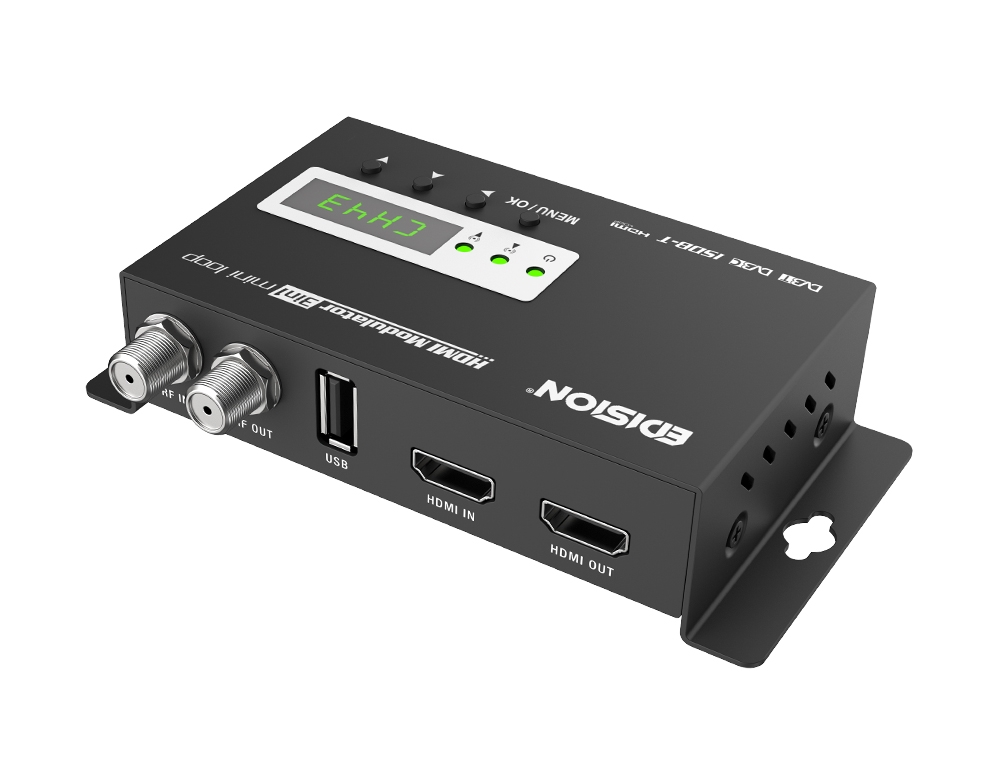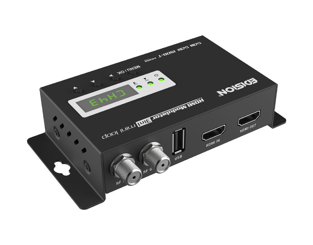 Ψηφιακός μονοκάναλος HDMI διαμορφωτής με δυνατότητα απεικόνισης της πηγής HDMI στην κύρια τηλεόραση (HDMI-loop), επίσης διαθέτει RF-ΙΝ ΕΙΣΟΔΟ μίξης. Με είσοδο σήματος από οποιαδήποτε πηγή HDMI (Δορυφορικό δέκτη, TV Box, CCTV, DVD, Digital Signage κ.ά.), διαμόρφωση και έξοδο σε Επίγειο Ψηφιακό DVB-T, ISDB-T ή Καλωδιακό DVB-C MPEG4 FULL HD σήμα. Παρέχει εξαιρετική ποιότητα σήματος στην έξοδο του, σε συνδυασμό με την γρήγορη ρύθμιση με την λειτουργία ID Pre-Config και εξοικονόμηση χώρου στην εγκατάσταση με εξαιρετικά compact διαστάσεις για ευκολία τοποθέτησης, ακόμα και όπου υπάρχει ελάχιστος χώρος.