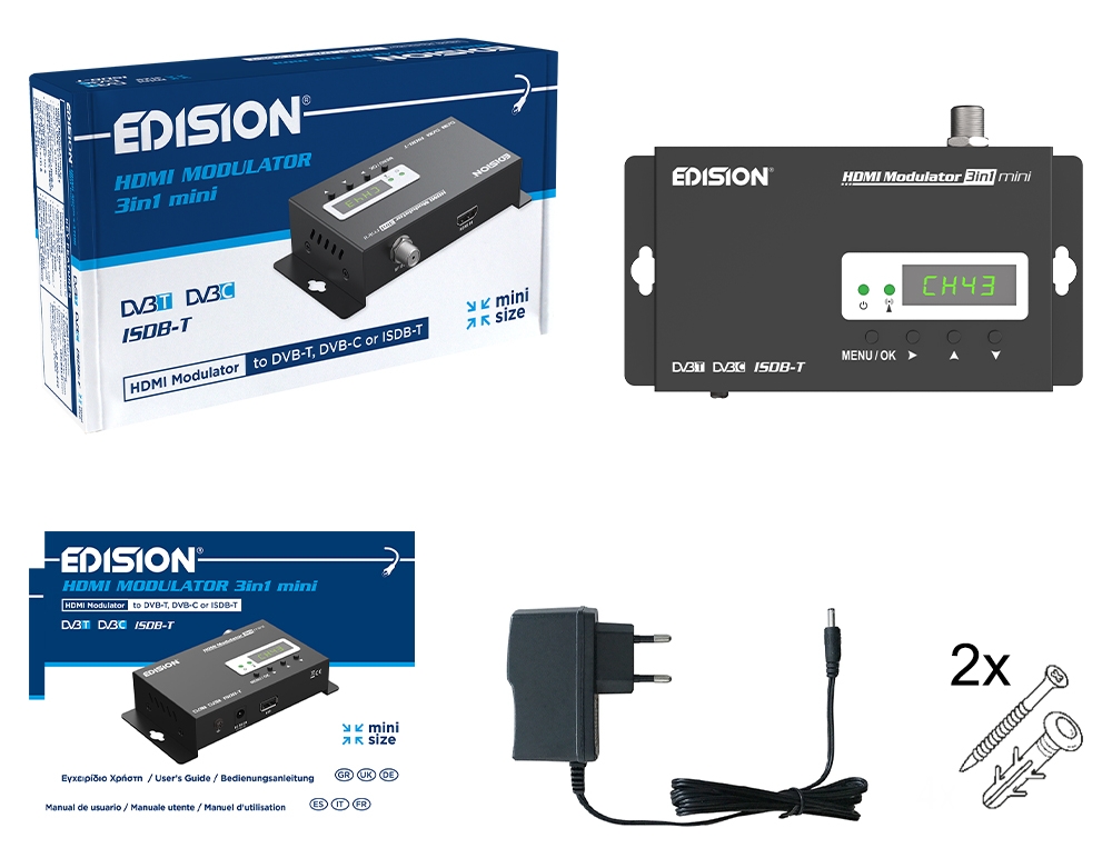 Digital single channel HDMI modulator 3in1 EDISION in mini size. HDMI signal input from any HDMI source (Satellite Receiver, TV Box, CCTV, DVD, Digital Signage, etc.) can be converted up to FULL HD 1080p Digital Terrestrial DVB-T, ISDB-T or Cable DVB-C MPEG4 signal output, in VHF or UHF band. Easy and fast configuration with the ID Pre-Config function and space saving in the installation with highly compact dimensions for an easy installation, even in minimal space conditions.
