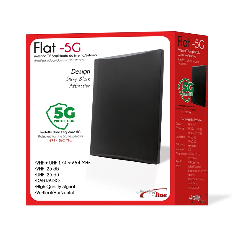 Η κεραία JL45030/5G JollyLine ΕΣΩΤΕΡΙΚΗ ΚΕΡΑΙΑ Digital Flat 5G για λήψη Επίγειων Ψηφιακών τηλεοπτικών καναλιών DVB-T/T2, με αποκοπή παρεμβολών 5G, προορίζεται για εγκατάσταση σε εσωτερικό χώρο. Με ιδιαίτερη σχεδίαση και σύγχρονη αισθητική, σας προσφέρει εξαιρετικά εύκολη τοποθέτηση σε οριζόντια επιφάνεια (πχ έπιπλο), καθώς και δυνατότητα ανάρτησης σε κάθετη επιφάνεια (πχ πλευρά επίπλου, τοίχος), απλά με την επιλογή θέσης στην πολλαπλά ρυθμιζόμενη βάση της. Με το σύνολο των παρελκομένων εξαρτημάτων της τα οποία περιέχονται στην συσκευασία της, σας παρέχει ενσωματωμένη ενίσχυση 25db στα UHF & VHF. Επιπλέον, σας παρέχει φορητότητα, χάρη στο εξαιρετικά χαμηλό βάρος και στην συμπαγή σχεδίαση.