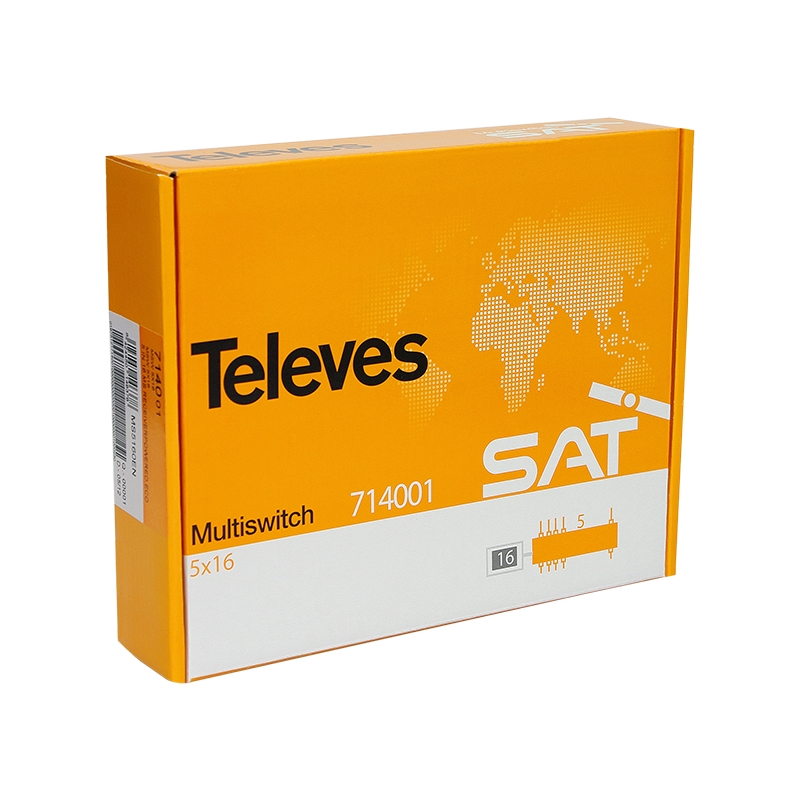Televes 714001 Multiswitch 4 satellite inputs and 1 terrestrial signal input for distribution to all 16 outputs.